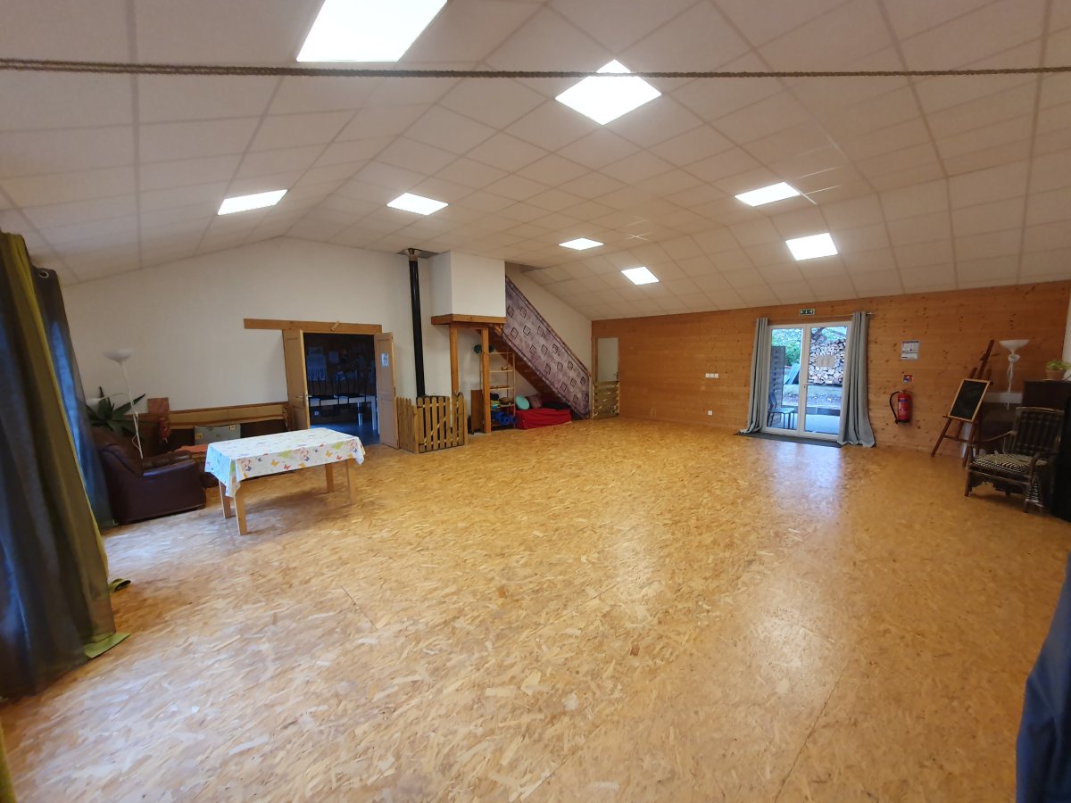 Au cœur de votre séjour, notre salle de 100 m², offre un environnement lumineux, accessible PMR, climatisée, chauffée au bois et entièrement équipé.